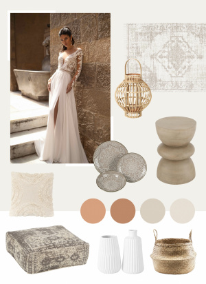 Uvoľnenosť, neformálnosť a splývavosť - taký je boho, inak povedané bohémsky štýl v svadobných šatách, aj dekoráciách. Boho svadobné doplnky sú zväčša inšpirované prirodzenou krásou. Nie je výnimkou, že bývajú ručne vyrobené alebo majú v sebe ukrytú istú tradíciu. Neodmysliteľne k nemu patria prírodné materiály a farby. Tie sa môžu vyskytnúť na textíliách, ako sú obrusy na stoloch, poťahy na vankúšoch, či vintage koberce, ktoré skvelo dotvoria celkovú atmosféru. Typické pre svadbu v boho štýle sú aj pohodlné oddychové zóny, ktoré tvoria boho vankúše, lampáše či iné svetielka.